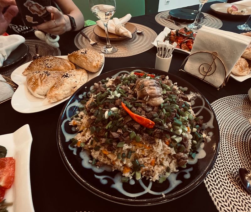 В первый день мы познакомились с нашим гидом Алексеем, который встретил нас в отеле и сразу отправил погружаться в кулинарные традиции кыргызской кухни. На мастер-классе готовили плов и самсу под чутким руководством хозяйки Чинары. Процесс оказался очень увлекательным - особенно запомнились раскатка теста для самсы и приготовление зирвака для плова.