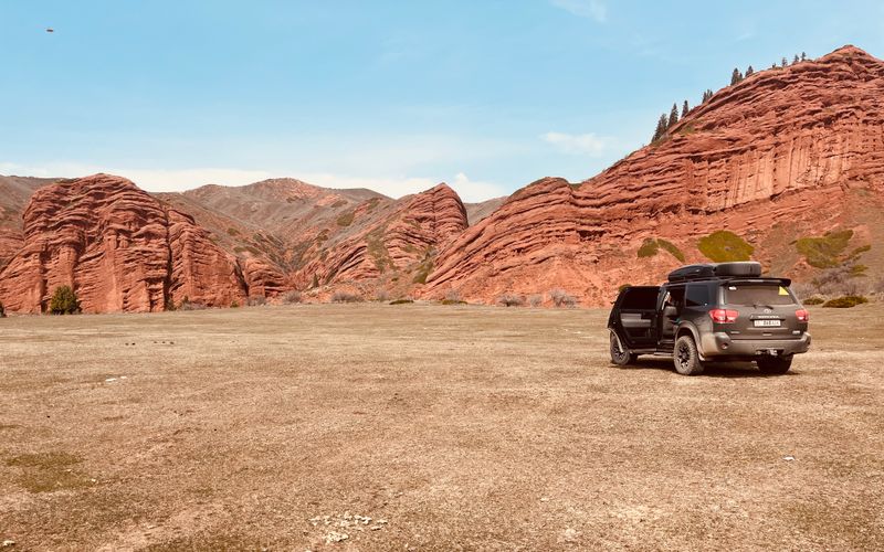 Переезды на комфортном автомобиле (водитель и 5 пассажиров), не длительные (не больше 3 часов), по красивым дорогам, без экстремального серпантина. Ночевка в разных локациях почти каждый день - от юрты и домика в горах до уютного отеля в центре Бишкека.