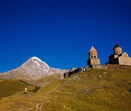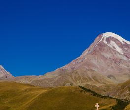 Гора Казбек находится на границе России и Грузии, и это самый восточный пятитысячник Кавказа.