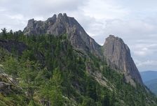 11:00 Выходим из автобуса посреди живописной высокогорной тайги. Распределяем продукты, настраиваем рюкзаки. Наш первый переход до стоянки чуть выше озера Радужное, расстояние 9 км. Ставим лагерь, обедаем, и наша первая радиалка - выход на Висячий камень, отсюда открывается хороший вид на знаменитого каменного великана - Спящий Саян. Овеянные многочисленными легендами, на протяжении многих сотен лет Висячий камень и Спящий Саян остаются самым величественным, таинственным и загадочным зрелищем в Ергаках.