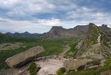 11:00 Выходим из автобуса посреди живописной высокогорной тайги. Распределяем продукты, настраиваем рюкзаки. Наш первый переход до стоянки на Каровых оз. (1631 м). Расстояние около 9 км. Ставим лагерь, обедаем, и наша первая радиалка - выход на Висячий камень (1700 м), отсюда открывается вид на знаменитого каменного великана - Спящий Саян (1987 м). Овеянные многочисленными легендами, на протяжении многих сотен лет Висячий камень и Спящий Саян остаются самым величественным, таинственным и загадочным зрелищем в Ергаках. Ночуем на Каровых озерах.