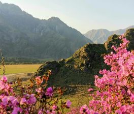После обеда нас ждет первое знакомство с цветущим Маральником в Чемальском районе! Участки вдоль дороги и склоны гор начнут покрываться розово-сиреневыми облачками. Сперва посетим Зубы Дракона каменный хребет, который находится прям посередине реки Катунь. Далее держим путь в сторону Ороктойского моста над самым глубоким и узким местом реки Катунь. А возле моста как раз находятся горы, покрытые Маральником, который обычно уже зацветает здесь в конце апреля начале мая. Обязательная остановка для фотосессии! На обратном пути, по желанию группы, посетим ущелье Че-Чкыш по-местному Долина горных духов. Здесь нас ждет живописное ущелье с отвесными скалами почти в 200 метров, и смотровая площадка с красивым видом на Катунь и окрестности.
