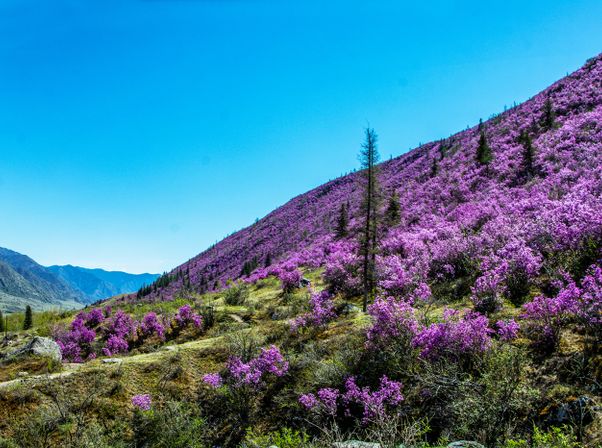 - В этой поездке мы увидим не только усыпанные цветами фиолетовые горы Алтая, но и снежные вершины, потрясающие по крутизне перевалы, бескрайние степи, величественную тайгу с могучими кедрами и замёрзшие водопады.