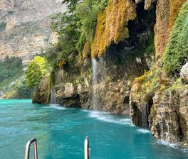 Сулакский Каньон: Покоряя Воды на Катере. Вас ждет захватывающее катание на катерах по изумрудным водам Сулакского каньона, с прохождением прямо под живописными водопадами. Для этого мы спустимся на внедорожниках по захватывающей горной дороге к речному причалу в селе Зубутли.