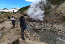 Утром приехала вахтовка и мы отправились на знакомство с вулканами. Профессиональная, слаженная работа команды была видна невооружённым взглядом. Наш гид Егор мастерски перезнакомил и сплотил нас пока ехали на первую стоянку. Когда Камчатка показывала своенравный характер погоды Егор не давал повесить нос. Весёлые, жизненные истории сыпались как из рога изобилия. Даже самый густой туман рассеивался и появлялось солнце и мы смогли увидеть даже больше заявленной программы.