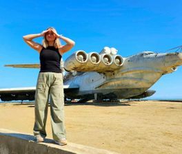 - Фото на фоне легендарного экраноплана Лунь на закате Каспийского моря