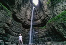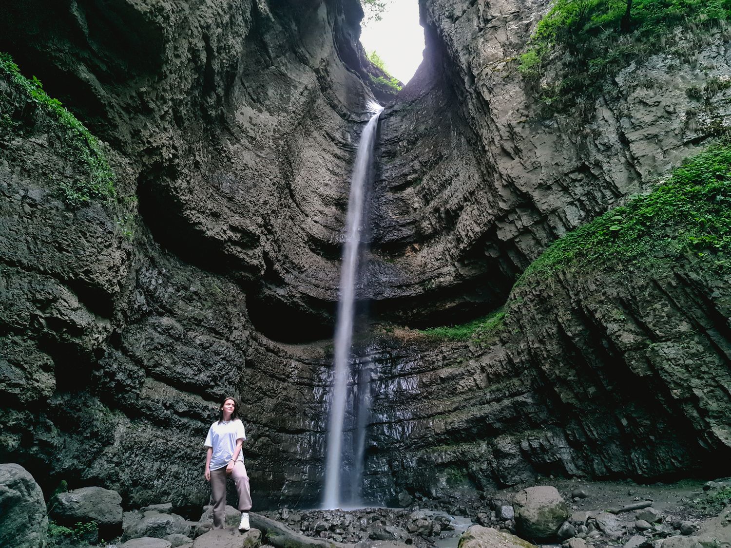 Большие Чегемские водопады (Главные): Расположены непосредственно в теснине. Это целая стена каскадов, где вода мелкими струями сочится прямо из расщелин скал, разбиваясь о камни в пыль. В солнечные дни здесь почти всегда можно увидеть радугу