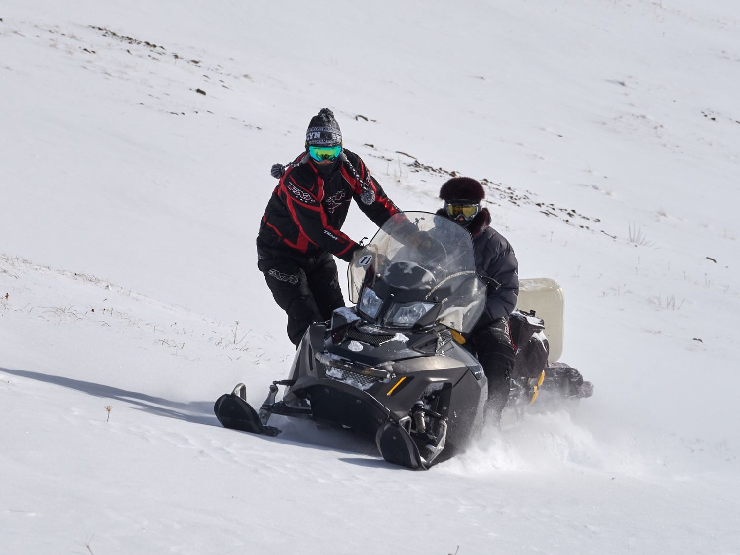 На снегоходах начинаем подъем на Кылайскую гриву.