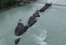 Забираем из города тех, кто прилетел заранее и сразу отправляемся в Чемал. Это самый популярный поселок на Алтае и мы не можем его пропустить. Начнем день с остановки на скалах Зубы Дракона прямо на реке Катунь. Тут же находится подвесной мост, по которому можно прогуляться и полюбоваться на красавицу реку.