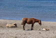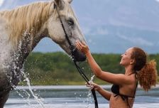 - Купание верхом на коне в озере с видом на вулканы