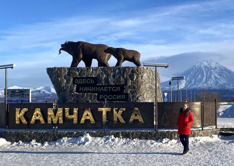 Знакомимся с гидом-водителем и отправляемся в путь. Первым делом посмотрим арт-объект «Здесь начинается Россия»: этот памятник посвящен медведице с медвежонком, которые отлиты в натуральную величину. Памятник установлен на фоне панорамы сразу пяти камчатских вулканов!