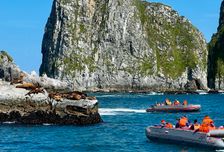 - Проведем день в океане: Пройдем до бухты Русской, увидим скалы Три брата, осмотрим птичьи базары на острове Старичков и, в завершение пути, на мысе Кекурном понаблюдаем за лежбищем сивучей; по пути в бухту Русскую и в самих ее водах нам могут повстречаться одни из самых больших обитателей морей и океанов — киты и косатки