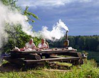 А вечером в деревне встреча с радушными хозяевами, ужин на высоком берегу реки, общение. Мягкие постели в номерах без комаров и страха замёрзнуть.