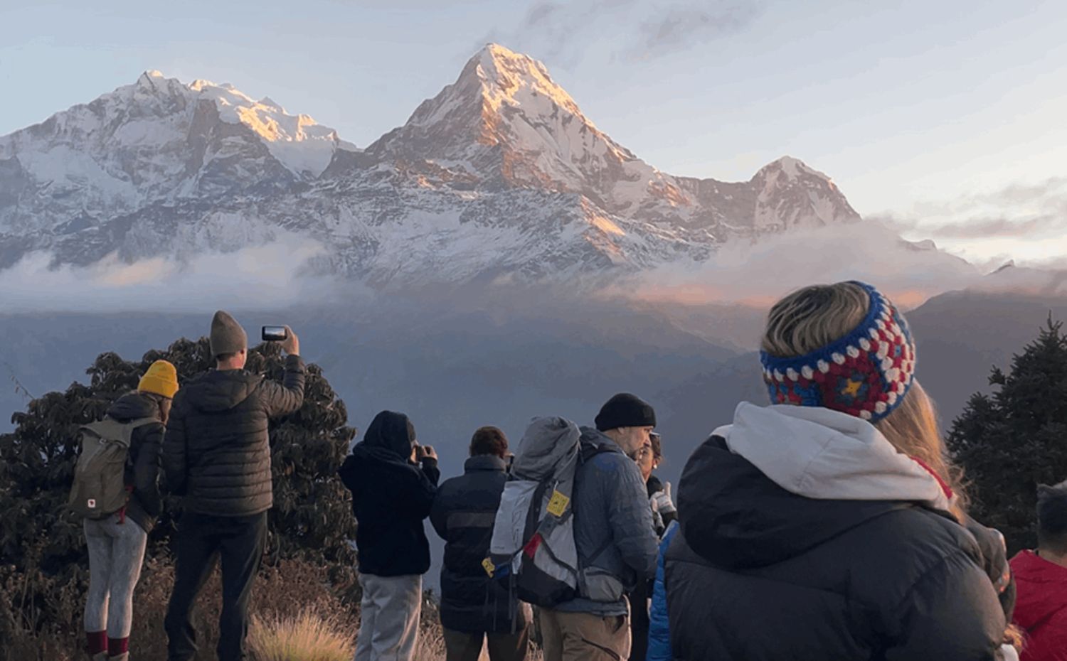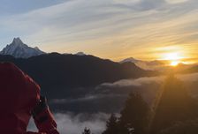 Полюбуйтесь захватывающим восходом солнца над горными хребтами Аннапурна и Дхаулагири.