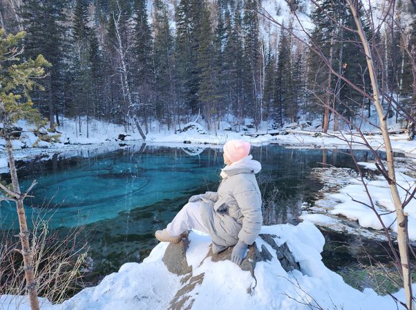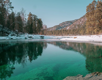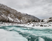 Заедем на Голубые озера, которые не замерзают даже зимой. Вода здесь имеет яркий бирюзовый цвет и здорово смотрится на фото. Озера еще называют Глаза Катуни. Увидеть их летом нельзя — озера превращаются в русло Катуни и в этих местах уже не погуляешь.
