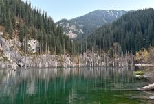 Вторая часть нашей экскурсии посвящается озеру Каинды. Место таинственное, почти мистическое. Озеро образовалось в результате землетрясения, затопив некогда густой хвойный лес. Верхушки их стволов до сих пор, словно мачты затопленных кораблей, возвышаются над водой. В то время как под водой, благодаря низкой даже летом температуре, невредимой сохранилась каждая иголочка. Несмотря на холод, в Каинды очень любят погружаться дайверы. Вода в озере кристально-прозрачная. Подводный лес можно разглядывать с берега. Глубина озера составляет примерно 15 метров.