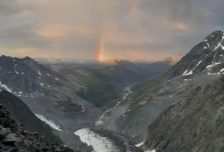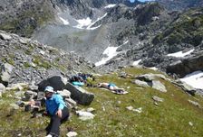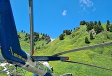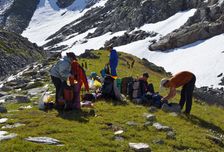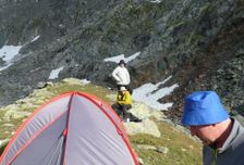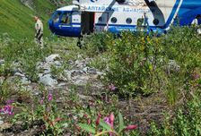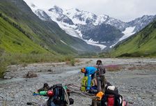На вертолете забрасываем груз и участников к истоку Катуни. Здесь разбиваем базовый лагерь где остается часть груза.
