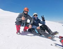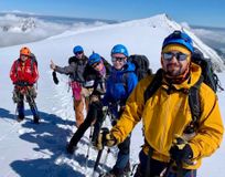 Опять же из-за неладной погоды и не очень позитивного прогноза было принято решение не повторять акклиматизационный выход, а этой же ночью выходить на штурм. Ну как ночью - почти утром) вышли в 3 часа, полпятого - пять поднялись к ОЖД. До самого пика идти, конечно, смысла не было. Надели кошки, двинули до Горы. Шли двумя группами. Наша ушла вперед. Где-то на плато сделали перекур, пошли дальше. Подошли к склону вершины, перецепились согласно уровню подготовки и пошли вверх. Было уже где-то 11 часов. Мы понимали, что скоро погода начнет портиться. Когда дошли до пересечения с тропой, идущей с юга, увидели, что некоторые туристы развернулись и пошли обратно. Но это не про нас) Продолжили подъем. Помню, Витя угрожал меня отцепить, из-за того, что ноги неправильно ставлю. Но он не знал, что я просто косолапый)) Вышли на седловину, а оттуда уже просто побежали к вершине - времени не было вообще. Сбегали до вершины, там встретили одного какого-то отчаянного иностранца, у которого порывом сорвало каску). Пофоткались, покатились вниз. Буран нас уже накрыл. Натурально сдувало со склона. С седловины зашли на склон, стало легче. Спустились к подножью, ветер, можно сказать, что стих, но снега навалило по колено или даже выше. Так и поковыляли к ОЖД, оттуда в лагерь, там поужинали и спать легли.