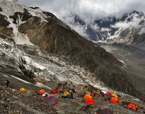 На третий день собрали лагерь и пошли до "креста" - предполагаемого места стоянки, но решили немного не дойти, потому как вперед нас ушло много групп, и был риск, что нам там просто будет не найти места. Встали метров на 300 ниже "креста", о чем ни разу не пожалели: удобное место, вода близко, виды прекрасные! Утром на четвертый день поднялись до "креста" и встали там лагерем. Пообедали и пошли на акклиматизационный выход до пика ОЖД, но немного не дошли, поскольку началась гроза, и наш гид Виктор благоразумно принял решение развернуть группу. Надо сказать, что погода была, мягко говоря не супер, но и не смертельной. Помогало пережить это все вкусное и разнообразное питание, которое организовали супер)). Нет, мы все на сублиматах и сухарях бы протянули вполне, но когда в таких местах ешь почти домашнюю еду - это прям очень круто!!