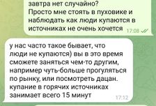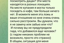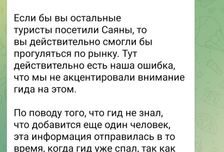 В день экскурсии гид не знал, что я присоединилась к группе (на что организатор мне ответил, что просто поздно ночью ему сообщили, но я сильно сомневаюсь, что утром он не проверил бы телефон, так что ложь 4). И вот, я гуляю по достопримечательностям, уже планирую, как вернусь и что буду делать, пока все купаются (чтобы в моменте не задерживать группу) и мы все дружно уезжаем на горячие источники в совершенно другое место, где я могла только посидеть в кафешке. Когда я спросила у гида, есть ли там что-то КРОМЕ кафе, мне сказали, что торговых центров и кинотеатров еще тут не возвели, поэтому посидим в кафе. Я уже была сыта и просто в расстроенных чувствах пошла шататься по деревне (с чувством, что мне просто втюхали что было и облапошили, лишь бы не возмущалась). На замену отмененной Листвянки мне предложили только 1 экскурсию, а вопрос есть ли другие проигнорировали и наврали, что мне будет, чем заняться. Мне опять пообещали, я построила какие-то планы, и они рухнули. По сути ничего сильно страшного не случилось, мне не трудно подождать 40-50 минут в кафе, но если бы не было ложных ожиданий и планов. Позже мне объяснили, что источников два, и гиду не сказали ехать на ближние, чтобы я могла погулять (опять случайность, невнимательность и все такое).