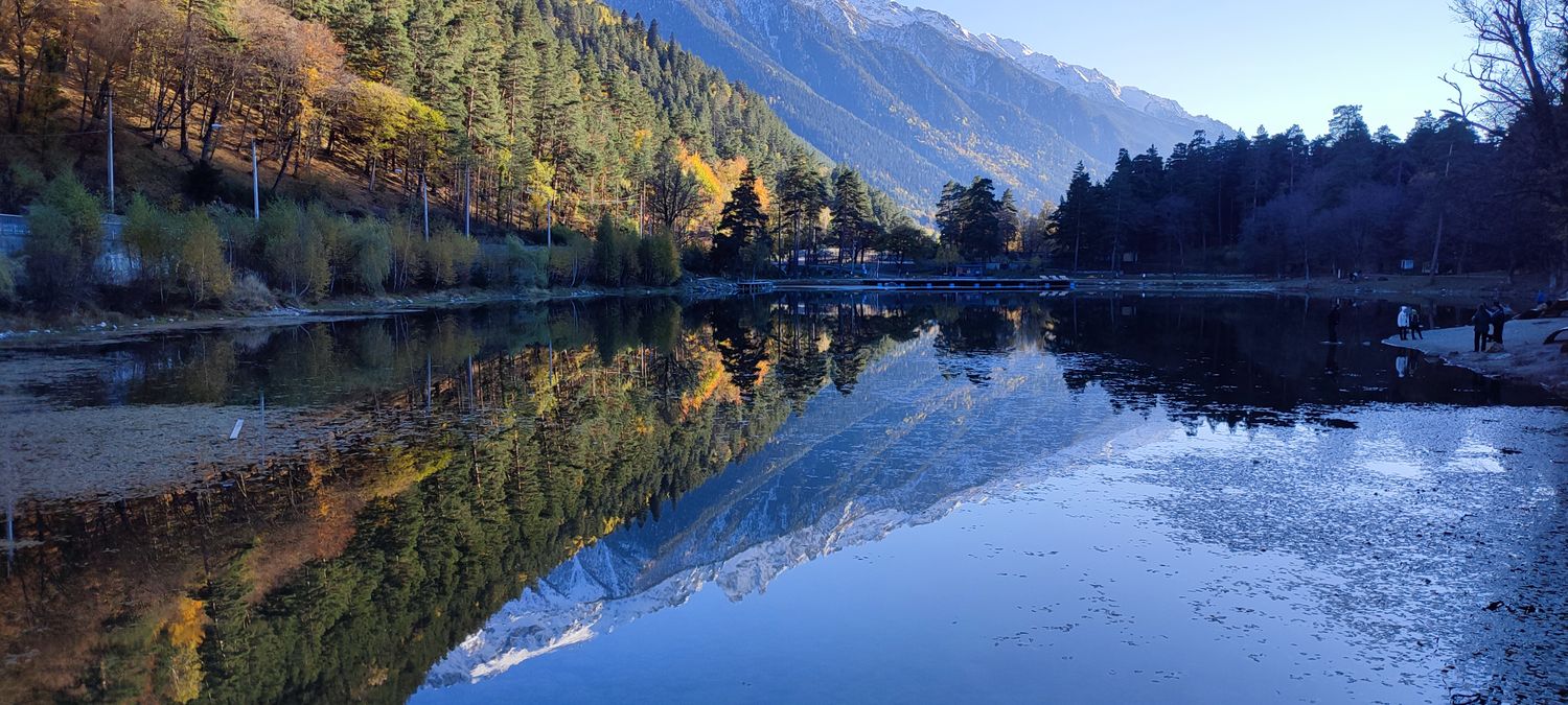 Продолжаем наш путь, и в самом сердце п. Теберда расположилось озеро Кара-Кёль, в его темных водах отражаются окружающие хребты гор, а по берегам растут могучие пихты.