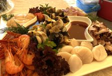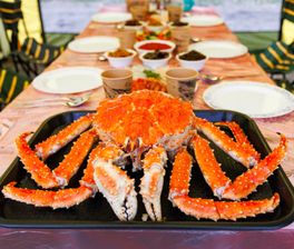 Примерное меню (может меняться в зависимости от меню ресторана): крабовый суп с яйцом, салат Сябу-сябу (свинина, овощи, руккола, соус сябу-сябу), камбала жареная (камбала филе, соус тенцую), морс.
