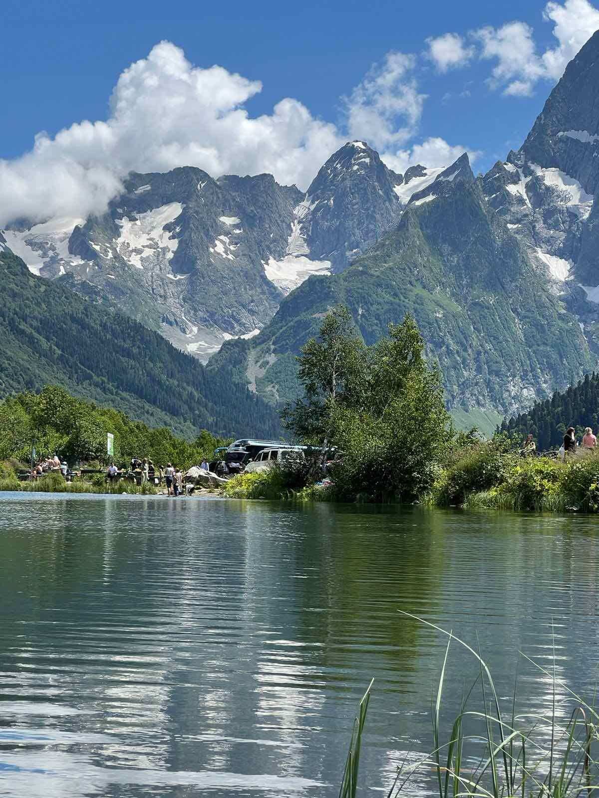 Канатная дорога в Домбай очень красивая (цена на август 2024 1500-2500р зависит от высоты). По дороге остановились на красивом озере. Много локаций с сердечками для фото. На обратном пути заехали в красивый храм.