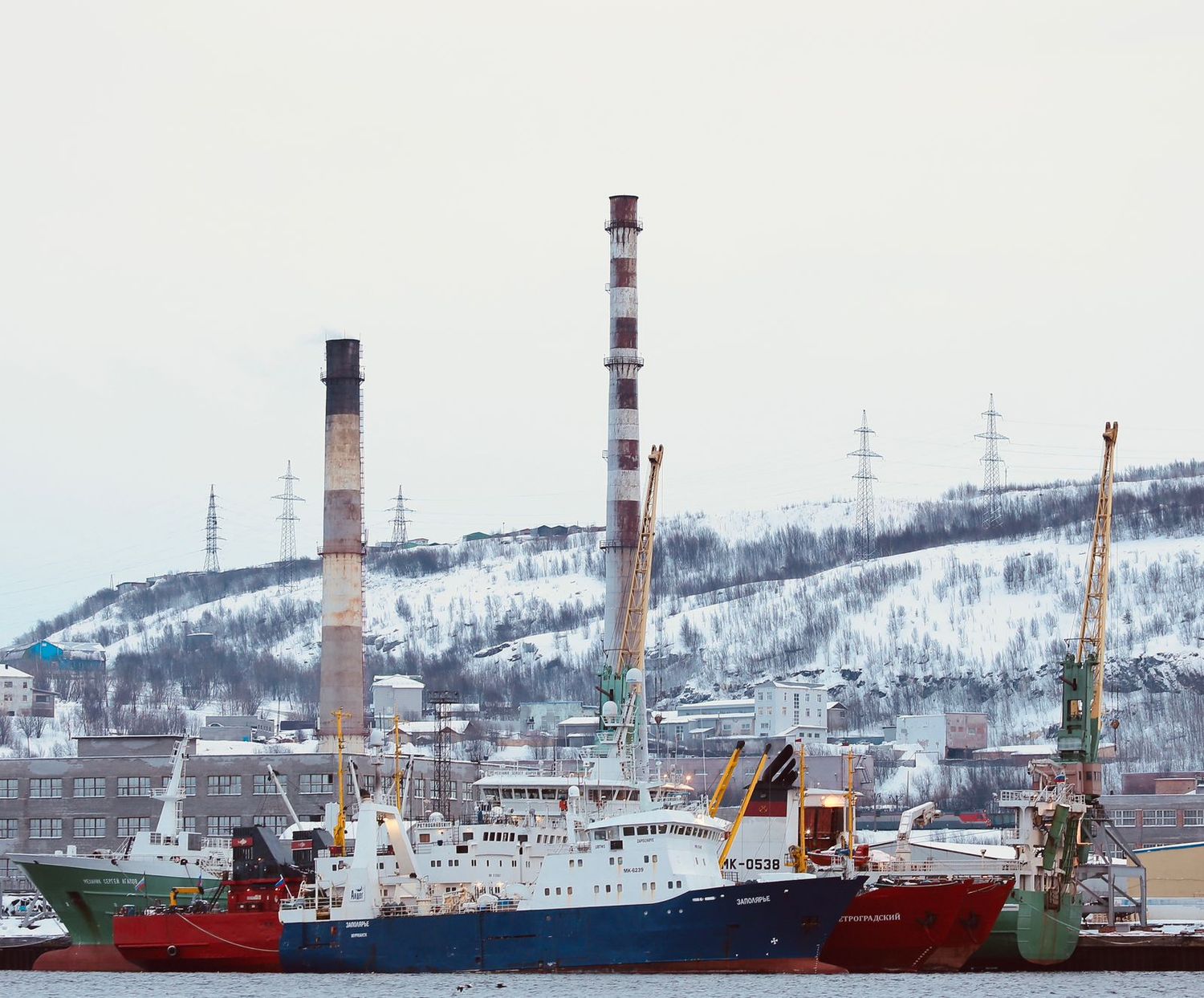 Военные корабли, авианосец Кузнецов, огромные рыболовецкие и грузовые суда разных стран, буровые установки, судоверфь с плавучими доками, торговый порт, рыбный порт, атомфлот и Атомные ледоколы (Арктика, 50 лет Победы, Сибирь, Россия, Советский Союз, Ямал, Ленин, Таймыр, Вайгач), Центр строительства крупнотоннажных морских сооружений Новатек.