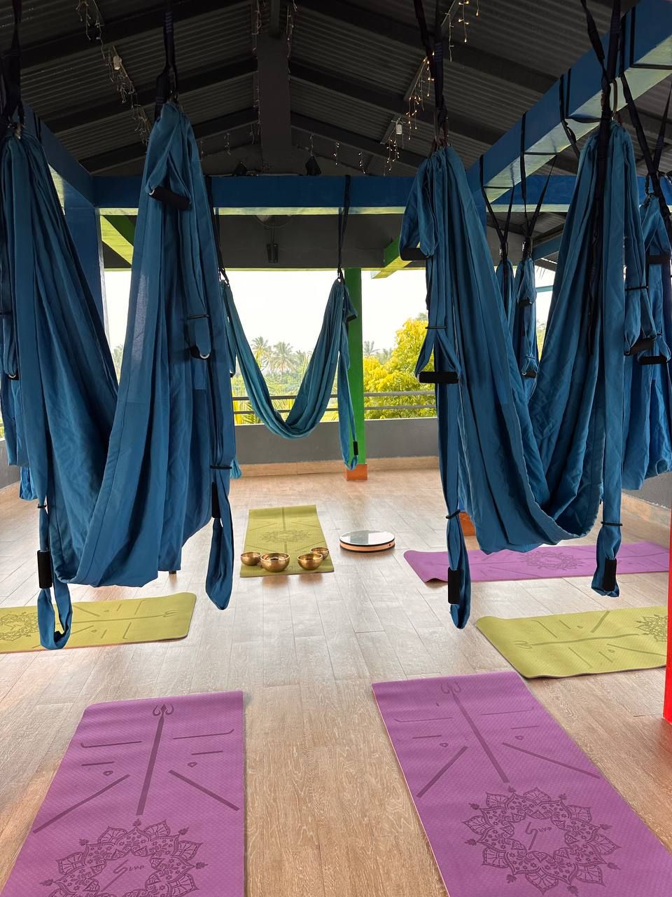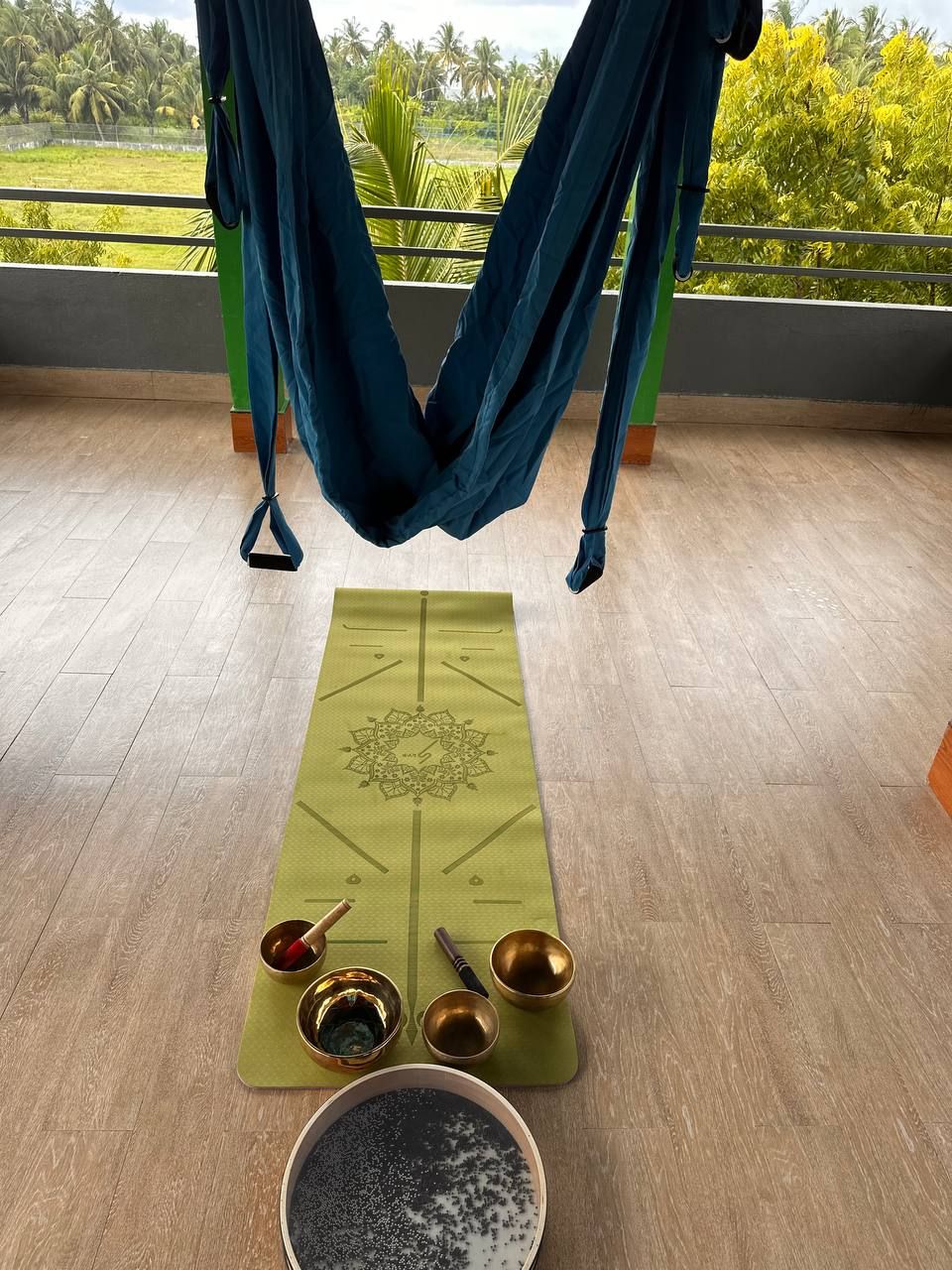 Йога в гамаках на веранде под звуки чаш и шум прибоя.