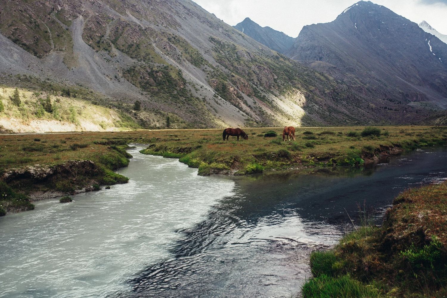 На пути у нас сегодня Семинский перевал — самая высокая точка Чуйского тракта (1894 метров над уровнем моря). Место считалось священным у алтайцев, а теперь тут кафе и рынок. Следующий перевал — Чике-Таман (1460 м) Хоть он и ниже, чем Семинский, зато более живописный — на него ведет крутой серпантин, настоящие американские горки. Обязательно сделаем остановку на его вершине, чтобы полюбоваться на Алтайские горы и немного размяться. Еще одно знаковое место, которое мы будем проезжать сегодня — слияние рек Катунь и Чуя. Видно, какие это разные реки и по цвету, и по характеру.