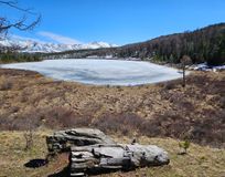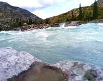 главную реку Республики Алтай - Катунь, местами с ее бурной водой, местами, покрытую льдом ,