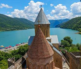 На берегу Жинвальского водохранилища величественно возвышается крепость Ананури, бывшая резиденция могущественных эристави Арагви, чьи каменные стены хранят отголоски сражений и преданий минувших веков.