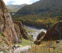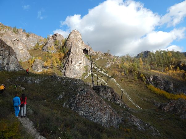 Пеший маршрут по Тропе Предков (тропа шаманов) начинается у моста через Белый Июс около села Ефремкино. Тропа идет по высокому берегу реки опускаясь и поднимаясь, проходя по долинам, аркам и крутым склонам. Древнее название этого уникального скального массива — Тогыс Аз, что означает Девять ртов. И действительно, если посмотреть с противоположного берега на тот по которому проходит тропа, можно увидеть 9 больших гротов, похожих на раскрытые рты. Первый объект у которого следует остановиться -это грот Проскурякова — обиталище людей эпохи неолита. Выход из грота выполнен на южную сторону и хорошо прогревается солнцем. Перед гротом удобная площадка, защищенная от ветра и достаточно скрытая от глаз, рядом вода. Люди жили здесь на протяжении долгих тысячелетий и оставили множество следов своего быта, наскальные рисунки охрой возрастом 4,5 тысячи лет и руническую надпись. От грота тропа идет вверх по скальному кулуару и через низкую карстовую арку выводит на гребень хребта откуда открывается живописный вид на долину Белого Июса. Вскоре нам встретится древняя выработка, где предки добывали руду. До сих пор в отвалах шурфа много железной руды и камней с зеленым налетом окислов меди. На самом верху массива Тогыс Аз есть еще одна огромная арка. Проход под ней частично перегорожен каменной стеной, а у северо-западного портала находится вход в пещеру Миртовская. Здесь нет больших пещер, но для историка и археолога наверняка есть что поискать. Неоднократно встречаются гроты с частично заложенными входами, следами кострищ, с непонятными выбитыми на камнях знаками. Места удивительно разнообразные и красивые, неповторимые пейзажи: горы, реки, тайга, каменные стены древних сооружений, таинственные гроты. Приглашаем всех любителей активного отдыха посетить данный район.