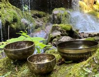 медитации с тибетскими поющими чашами на закате.