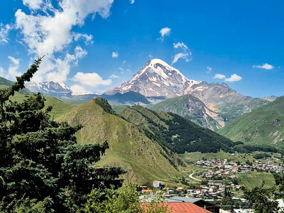 Наш день начнется в Степанцминде (бывший Казбеги), городок в окружении кавказских гор на высоте 1744м. Здесь заселяемся к наш красивый отель с видом на Казбек и идем обедать.