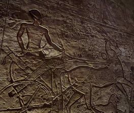 По стенам храма Рамзеса есть яркие разноцветные изображения, показывающие сражения Рамзеса с хитами на колеснице.
