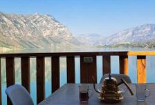 - Проживание на базе на берегу озера с невероятным видом на горы (отдельные домики со всеми удобствами)
