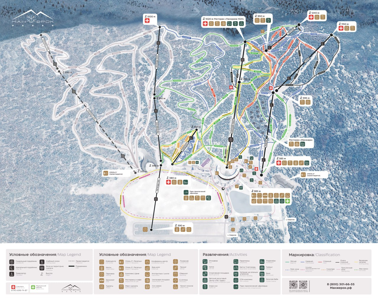 Манжерок расположен у подножья гор Малая и Большая Синюха на высоте около 1200 метров с мягким микроклиматом и чистым горным воздухом. Трассы разной протяженности подходят как новичкам, так и профессионалам.