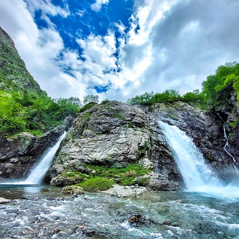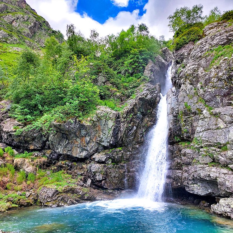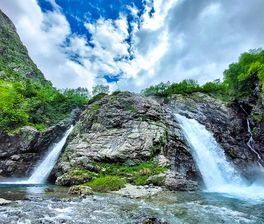 - Дамхурц живописный. Здесь Очень много озер и водопадов. Поскольку это наш любимый западный Кавказ, то озера здесь прозрачные, все как мы любим! Ко многим достопримечательностям очень трудно добраться. Но природа все же позволила туристам ходить по некоторым своим ущельям, чтобы восхищаться местной красотой!