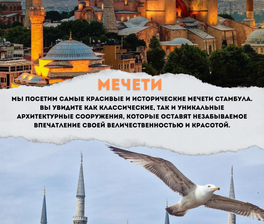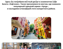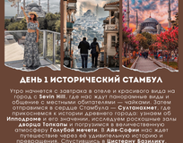 Впереди нас ждут яркие открытия, вкуснейшая турецкая кухня, вечерние панорамы города, прогулки по Босфору, незабываемые Принцевы острова и многое другое. Давайте создавать незабываемые впечатления вместе!