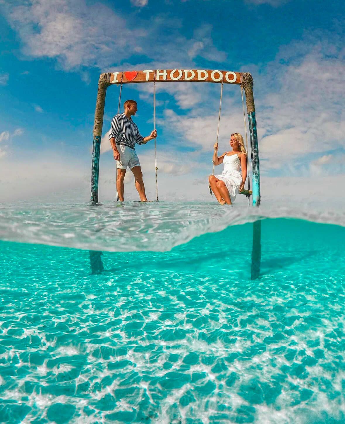 Освежившись под кондиционером… о, да… жарковато, но это же Мальдивы, приняв охлаждающий душ и немного повалявшись на кровати, мы направляемся на белоснежный пляж с идеальным прохладным песком. По пути гид расскажет немного об острове Thoddoo, покажет, где купить фрукты, где находятся туалеты, душ, коралловый риф, лежаки, гамаки и прочее.