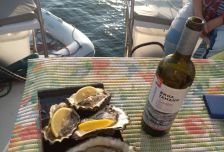Выходим в пролив Старка, который разделяет острова Русский и Попова. Желающие купаются (кстати, обычно желают все) и все вместе пробуем первый обед от нашего кока.