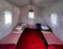 Проживание: в палаточном лагере, одна отапливаемая, утепленная палатка на двух-трех человек, в каждой палатке стол и два стула либо табуретки, раскладушки, одеяла, подушки, комплект постельного белья в том числе 3 полотенца на человека, дополнительно спальники.