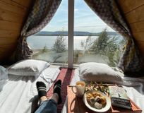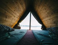 Заночуете вы в уютных и стильных домиках A-frame на турбазе Лунный свет. И действительно, свет луны вы сможете наблюдать прямо с кровати: панорамные в пол окна — преимущество турбазы. А стоят домики на самом берегу реки Лена — с видом на визитную карточку Якутии - Ленские столбы. Так что вы сможете наблюдать и рассвет, и закат. А это фантастическое зрелище!