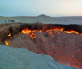 - Огненный кратер Дарваза — невероятное зрелище пылающего газа в центре пустыни. Стоять рядом с этим Вратами ада и смотреть, как огонь отражается в темноте ночного неба, ощущение завораживающее и незабываемое.