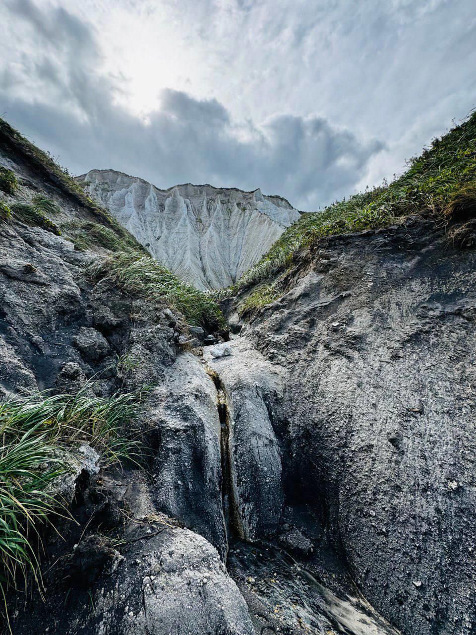 - Загадочные белые скалы на фоне чёрного песка и изумрудного леса на Итурупе