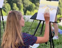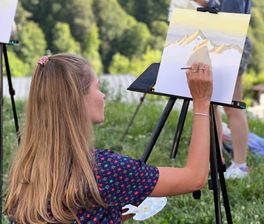 мастер класс по живописи, рисуем на плэнере под руководством художницы с видом на горы