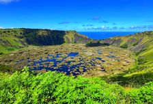 Осмотр острова начнем с вулкана Рано Кау размером 1.6 км в диаметре и глубиной более 200м. В кратере вулкана находится большое пресноводное озеро с чистой водой. На протяжении многих веков расположенное возле вулкана Оронго озеро было главным церемониальным центром, где можно увидеть более 100 петроглифов с изображением главных божеств острова человека-птицы.