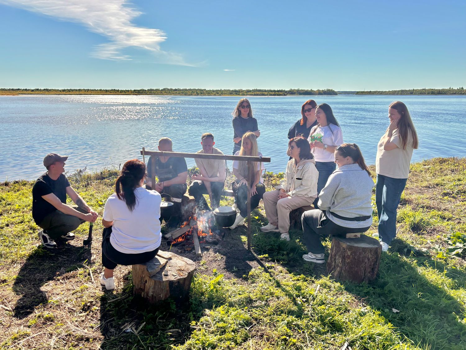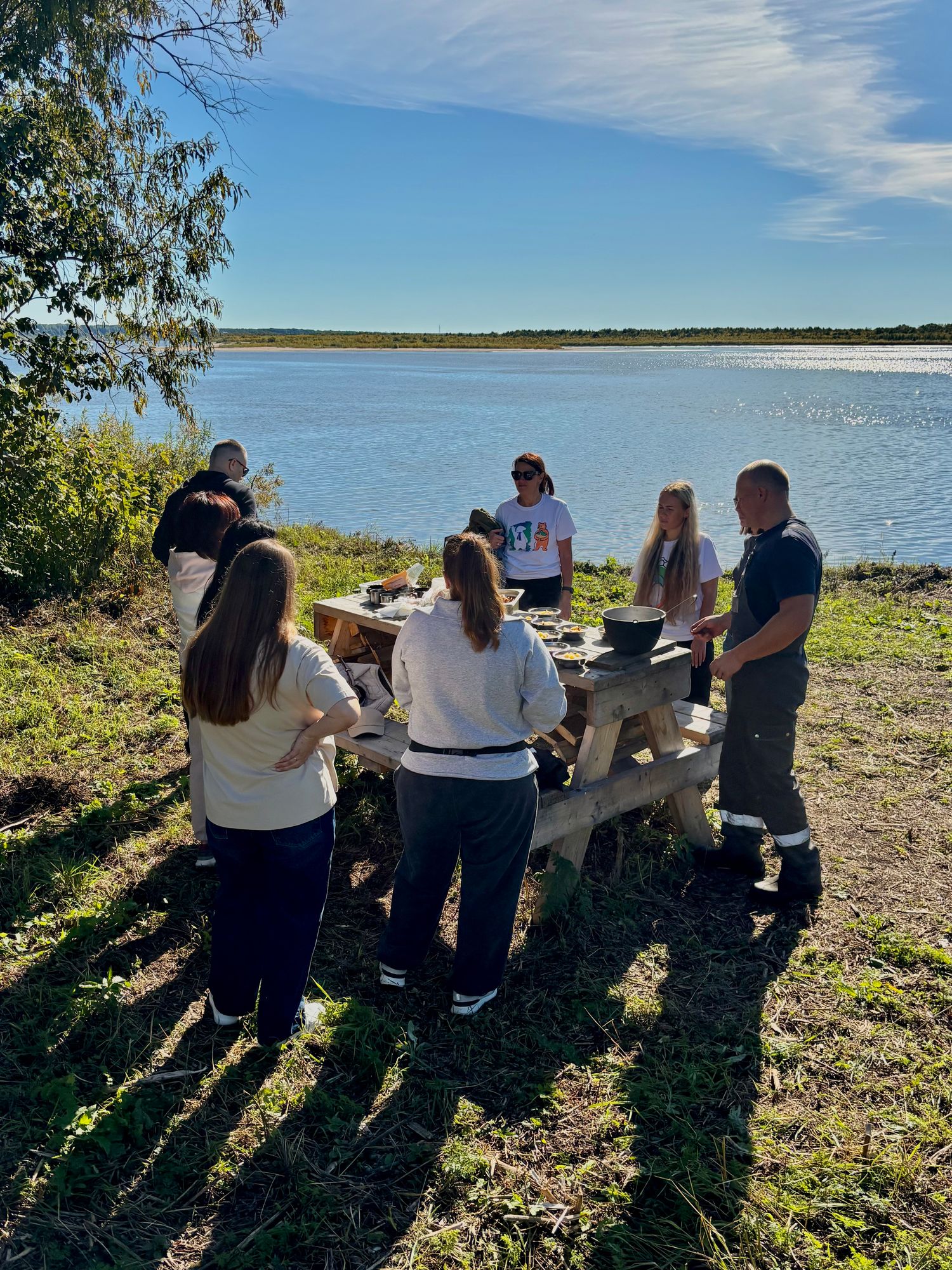 - На берегу Северной Двины группу ждёт настоящий отдых на природе. Здесь вас угостят сытным обедом охотника, приготовленным на костре: горячим супом, ароматным чаем с травами и домашней выпечкой. Гид поделится историями о северной рыбалке и охоте, расскажет легенды и байки, которые создают особую атмосферу этого места.