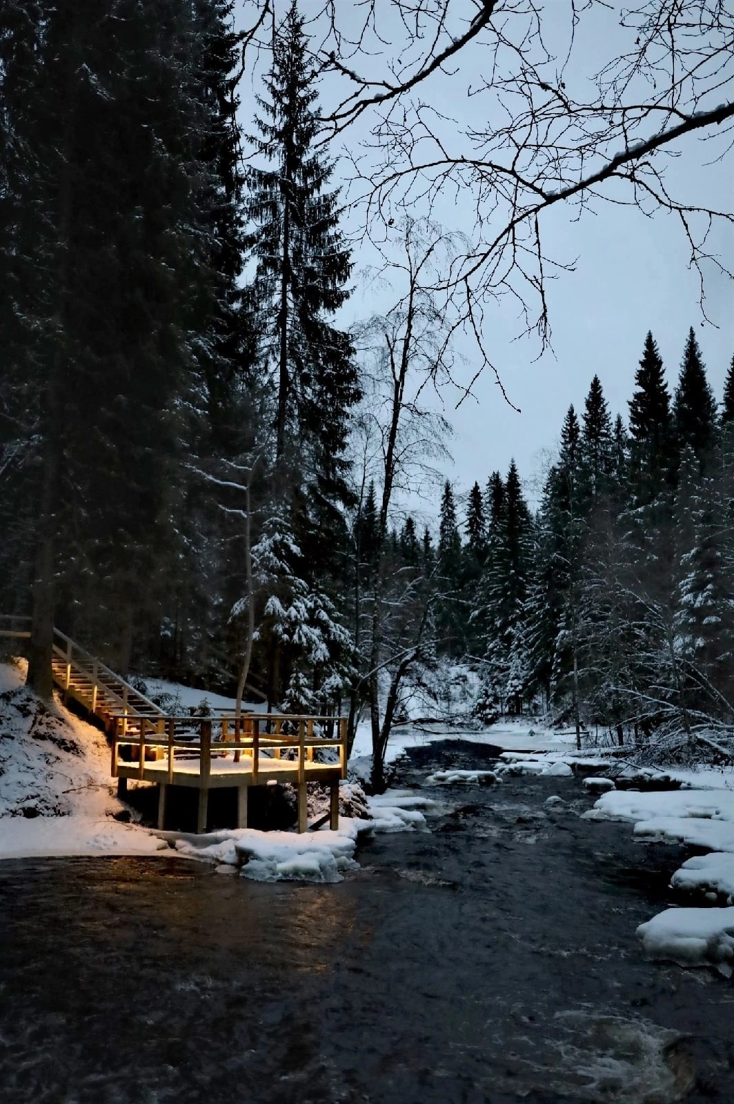 Нас ждёт одно из самых живописных мест этого маршрута — Долина водопадов. К ней ведёт эффектная деревянная лестница, а в конце тропы — точная копия старинной мельницы, стоявшей здесь 200 лет назад. Вокруг — заснеженные ели, шум воды и чистейший морозный воздух.